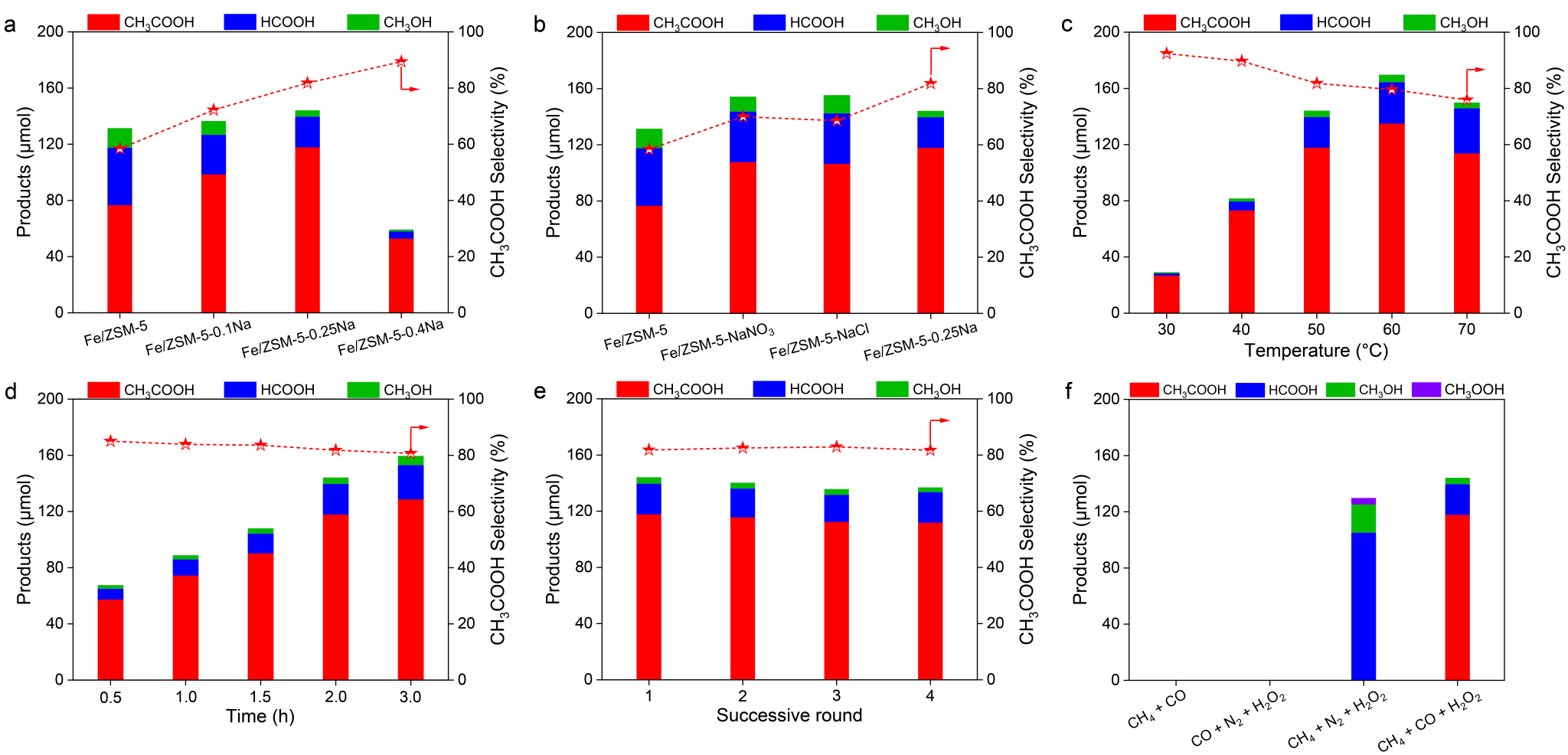 近日,中国科学技术大学曾杰教授团队在甲烷选择性氧化制乙酸研究中取得重要进展。在本研究中,研究人员报道了一种富含钠改性骨架铝结构单元(Si–ONa–Al)的分子筛负载铁催化剂,该催化剂在水中以过氧化氢为氧化剂,并在一氧化碳存在下将甲烷氧化为乙酸。具体而言,该催化剂中的钠改性骨架铝结构单元能够向铁物种提供电子,形成富电子铁活性位点。这些富电子铁活性位点促进了一氧化碳插入,并通过甲基中间体与一氧化碳的碳-碳偶联增强了乙酸的生成。在50摄氏度反应2小时的条件下,该催化剂的含氧产物总量为144.1微摩尔,其中乙酸选择性达到了81.8%,这一结果显著优于未改性分子筛负载铁催化剂(含氧产物总量为131.4微摩尔,乙酸选择性为58.4%)。相关成果以“The Importance of Si─ONa─Al Moieties in Fe/ZSM-5 Zeolite Catalysts for Selective Oxidation of Methane to Acetic Acid”为题发表于《德国应用化学》杂志(Angew. Chem. Int. Ed. 2025, e202511056)。