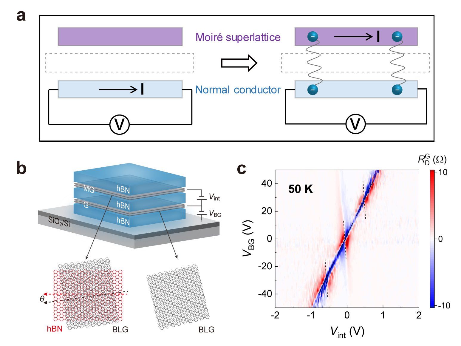 在二维层状材料体系中,通过人工堆垛构建莫尔超晶格已被证明是一种调控电子能带结构和量子物态的重要手段。然而,周期性莫尔势场会随着远离堆垛界面而快速衰减,使得莫尔调控效应局限于超晶格界面附近,制约了其潜在应用。团队基于此前在二维体系拖拽效应的研究基础(Nano Lett. 20, 1396 (2020);Nat. Phys. 19, 372 (2023);Nat. Commun. 14, 1465 (2023)),提出了一种通过层间拖拽效应来拓展莫尔势场作用范围的全新研究思路。层间拖拽效应是指在两个空间相近但彼此绝缘的导电层构成的电双层结构中,对其中一层(主动层)施加驱动电流时,层间载流子之间动量/能量转移会诱导另一层(被动层)载流子移动,从而在被动层产生一个开路电压或闭路电流。这一动态过程由层间库伦散射这一长程相互作用主导,因此具备实现远程莫尔调控的潜力。