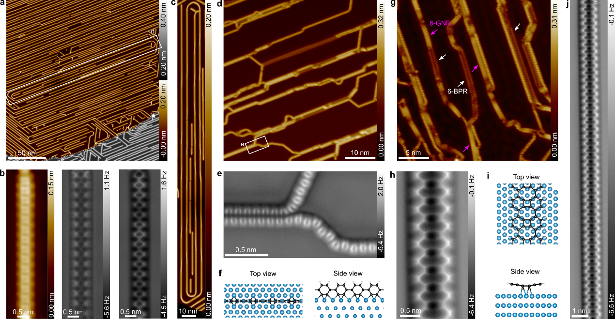 图2:表面合成的微米级聚对苯撑链及高质量联苯烯纳米带。