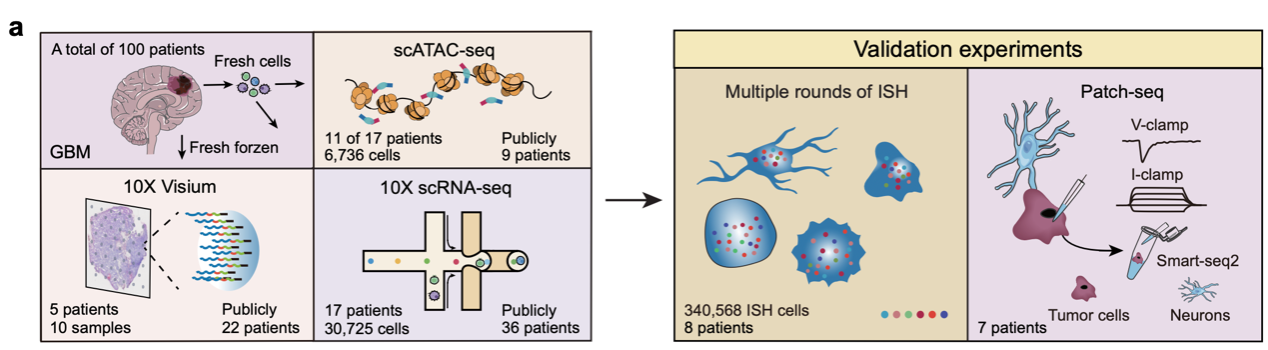 近日,中国科学技术大学生命科学与医学部瞿昆教授、唐爱辉教授课题组与附属第一医院神经外科程传东主任合作,成功创建了迄今为止最大规模的胶质母细胞瘤(GBM)单细胞和空间组学图谱,系统解析了GBM肿瘤及微环境细胞群落的空间分布、互作和时空演化规律。研究成果以“Spatial and single-cell characterization of human glioblastoma tumor microenvironment reveals malignant cellular communities”为题,4月16日在国际知名学术期刊《自然·神经科学》(Nature Neuroscience)上在线发表。