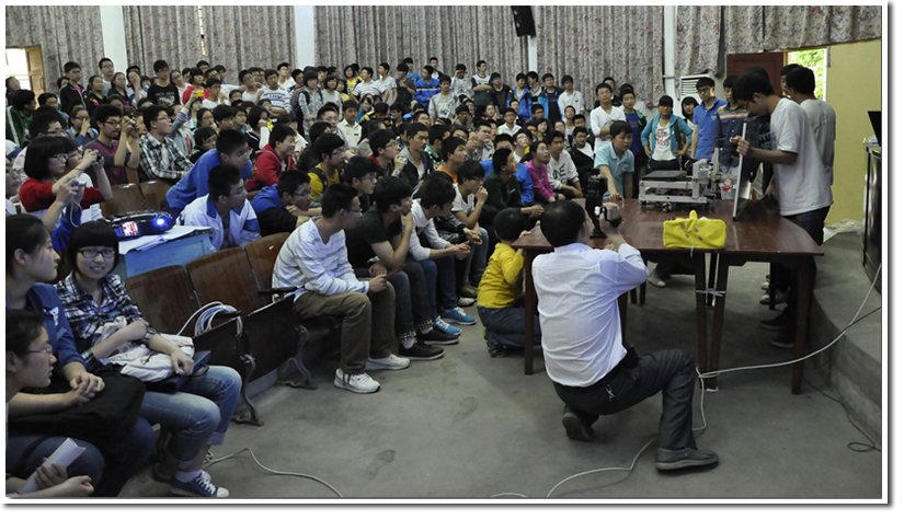 讲座开始首先播放了机器人俱乐部的robogame宣传视频。视频展示了robogame比赛中从2001年到2012年比赛的精彩内容,这些由我们学校同学自己制作出来的机器人吸引了所有参加讲座的中学生的眼球,小观众们不时惊呼,现场气氛热烈。