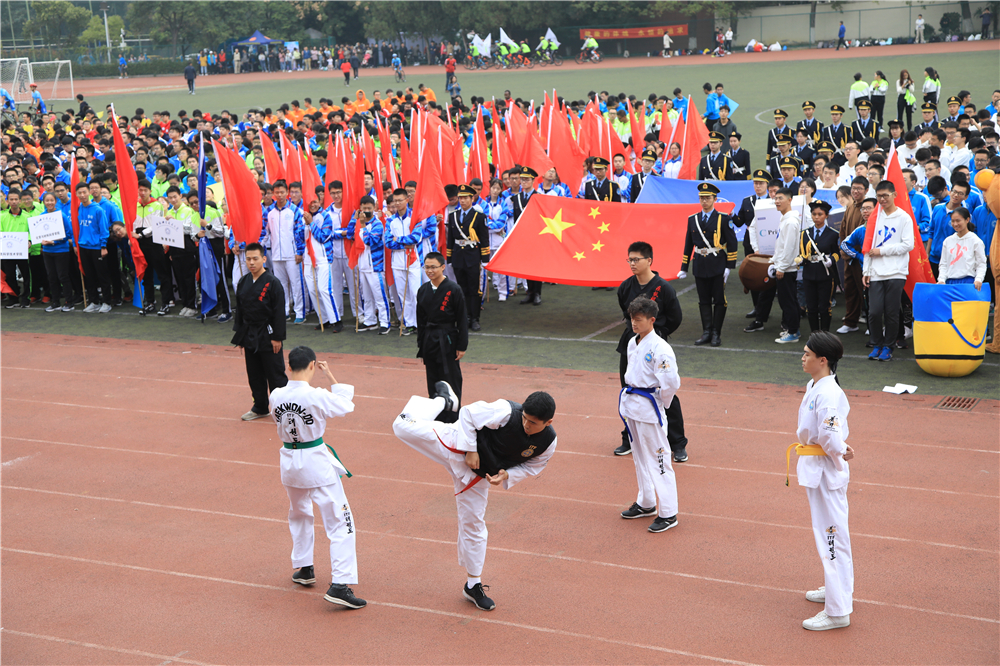 压轴出场的校园学生体育文化展示方阵带来了精彩纷呈的表演:校学生自行车协会流畅的表演展现出参与竞争、享受生活的精神风貌;羽毛球协会通过挑球、运球、反手、后杀等羽毛球基本动作展示了青春和力量;健身社的俯卧撑表演、武术协会的双截棍和跆拳道表演、战术团的战术表演、篮球协会的技巧表演、轮滑队的滑行表演,充分展现了科大学子青春激扬、充满朝气与活力的精神风貌,展示了科大学生的飒爽英姿。