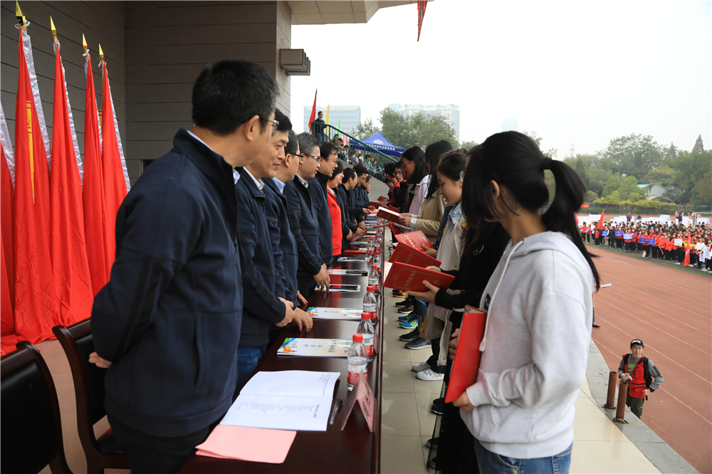 党委副书记蒋一致开幕词。他首先代表学校祝贺本届体育运动大会顺利召开,并对筹备本届体育运动大会的全体工作人员表示诚挚的谢意,对全体教练员和运动员致以亲切的问候。他说,在过去的一年里,在校党委的正确领导下,我校群众体育工作成绩显著,通过各方努力,学生体测达标合格率有了明显的提高,学生体育代表队在全国或全省各类竞赛中取得了许多好成绩,涌现出了像龙舟、足球、羽毛球等,多支在全省乃至全国高校中具有美誉度和实力口碑的体育代表队;体育课程改革继续推进,学生体育社团活动开展务实积极,成立社团覆盖20多个运动项目,常年开展多种多样的各类体育竞赛活动,丰富了校园文化生活;教工体育活动迎来了很好的发展时期,新组建和成立了一批体育协会,据不完全统计,这一年来,有数百名学校教工先后加入到了体育协会当中。