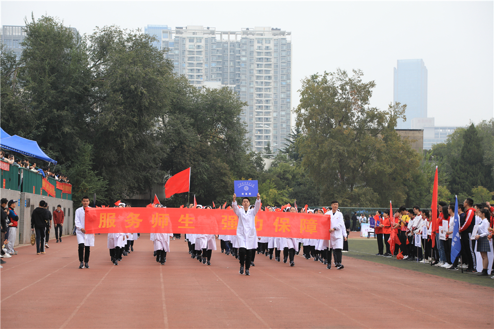 教工代表队也摆出各具特色的阵型:后勤联队的老师们气势昂扬;机关代表队喊着“向师生学习,为师生服务”的口号;离退休老师们迈着矫健的步伐,展现了最美的夕阳红。
