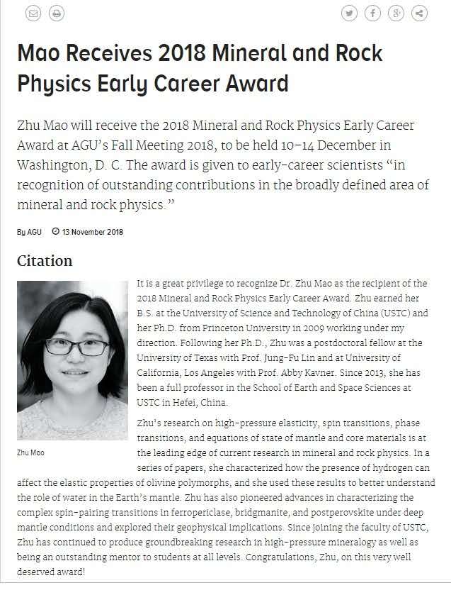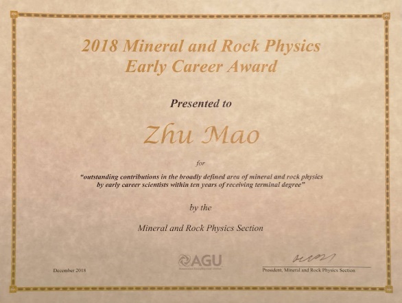 美国时间12月11日,我校地球和空间科学学院毛竹教授获得美国地球物理学会矿物岩石Early Career Award。该奖每年从全球遴选一名在获得博士学位(最终学位)10年内的青年科学家,以表彰其在岩石和矿物学研究方面取得的卓越贡献。这也是该奖设立以来首次授予来自中国的优秀青年科学家。