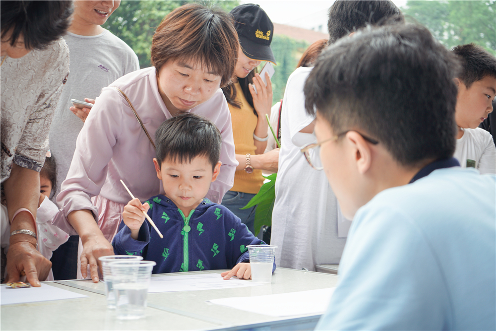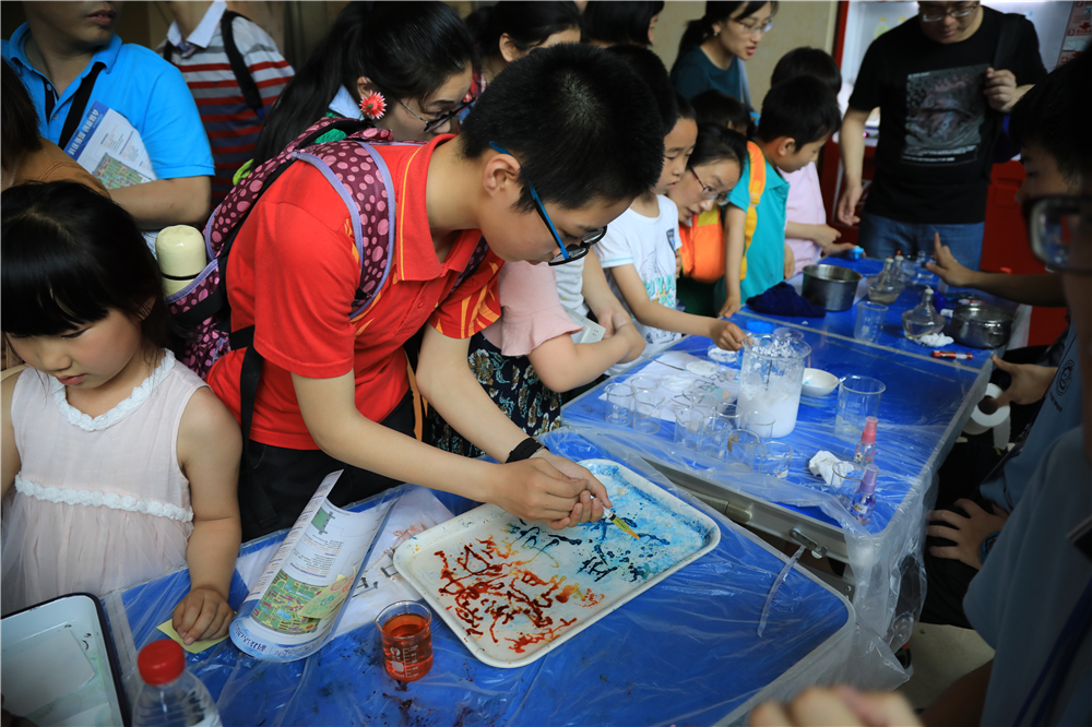 在东区,化学与材料科学科普点前来参观的孩子与家长围满了各个展区,热闹非凡。大厅里摆放着化学科普知识展板,五楼的大屏幕播放着有趣的实验视频,最受欢迎的则是二十多个有趣的化学实验:泡泡糖去哪儿了、大象牙膏、会“生气”的可乐、变色紫甘蓝、碟中惊奇、喷雾作画、叶脉书签制作……在志愿者的讲解和指导下,前来参观的小朋友们纷纷动手体验,感受化学世界的无限乐趣。更吸引人的是,参加完趣味小实验还能收集印章,兑换志愿者们精心准备的学校纪念品。在资环楼报告厅内,每天上午、下午还会各播放一场精彩的《什么是化学反应》的“化学秀”。