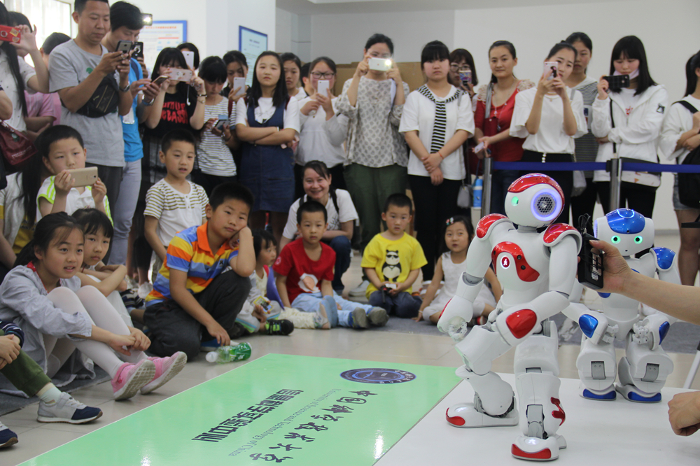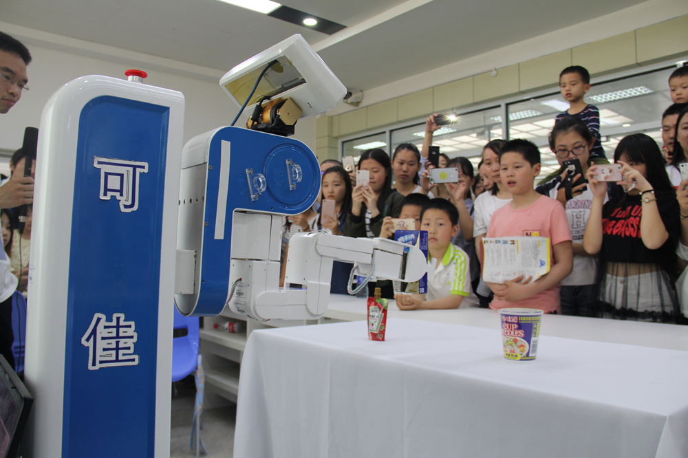 在西区,信息科学技术学院科普点门外,早晨8点开始,就有很多参观者在门口排队了。新闻中心记者在演示大厅看到,热情的孩子们已经围坐在地上,观看“NAO”机器人的表演,“NAO”正在为大家表演西游记的故事,惟妙惟肖的动作,娴熟而灵巧,引得现场的小朋友不时发出欢呼声和惊叹声。在计算机科学与技术学院科普点,智能服务机器人“可佳”根据演示人员的口头指令,自动寻找指定的物品并交给演示者,在整个过程中,聪明的“可佳”完全自主地完成任务,吸引了众多人的围观。