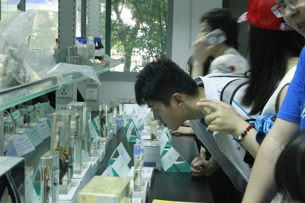 一走进生命科学学院的大厅,映入眼帘的是本年度显微摄影作品的展览,参观者还可以现场投票,选出喜欢的作品。除此之外,生命科学科普点的生物标本展示也吸引了很多人的驻足。志愿者李汶芳同学是生命学院的一名研究生,她介绍说,今天展示的植物标本都是师生们日常收集的科大的植物,值得一提的是“科大花事”的图片展示,通过花期时间对校园里的花卉进行了梳理,非常有趣,希望有更多的人能感受和关注身边的美丽。在动物标本展示区域,整齐的摆放着各种昆虫、爬行动物、哺乳动物的标本,让大家深深感受到大自然的神奇。