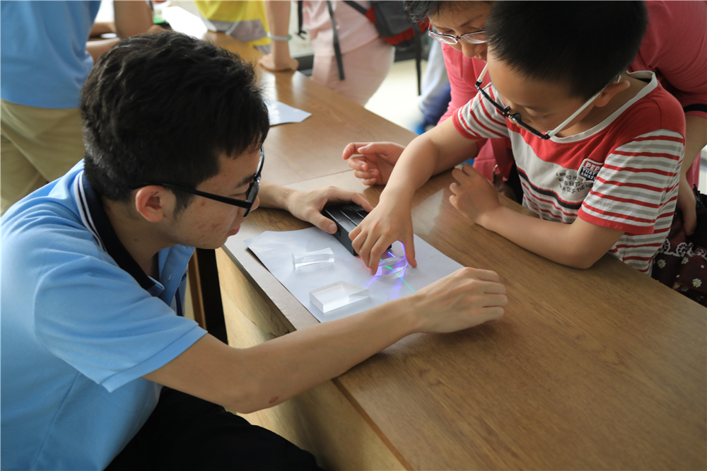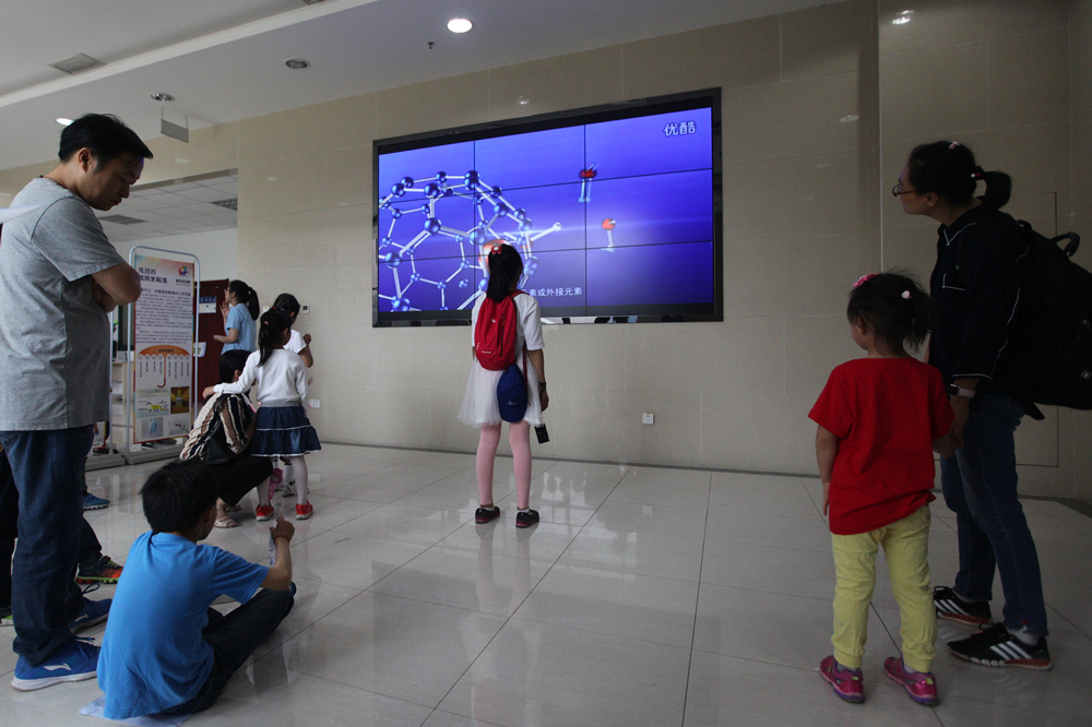 在核探测与核电子学国家重点实验室,科普展板向公众介绍了微观芯片探索、ICF中子飞行时间阵列、中子成像实验、粒子物理电子学和核信息处理等知识,同时STAR金原子核对撞实验、暗物质粒子探测、寻找来自星星的你——宇宙线实验简介、高能正负电子对撞击实验等视频科普讲座循环播放。在光电子科学与技术安徽省重点实验室,志愿者展示了三维立体显示技术、LED照明与光伏技术等项目。在“裸眼3D”展示台前,孩子们争相试看,纷纷感叹光学的神奇。