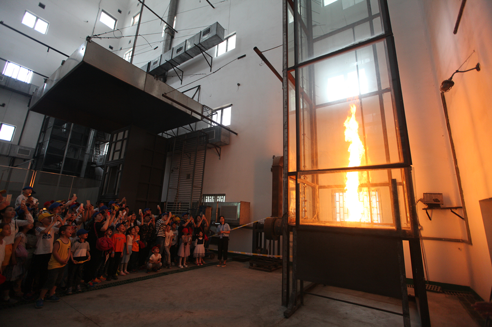 火灾科学国家重点实验室一直是最受关注的参观点之一,最吸引眼球的是火旋风大型实验。演示时刻一到,操作人员开始为大家演示:实验塔里的火苗开始燃烧,之后呈螺旋状迅速升腾,火越烧越旺,旋转愈加明显,直到燃料耗尽,引发了现场参观者的赞叹。此外,火灾科学国家重点实验室还安排了大型燃烧风洞实验台、小型科普实验演示以及科技展板和消防知识趣味答题等,以丰富多彩的形式向公众普及有关火灾安全知识。