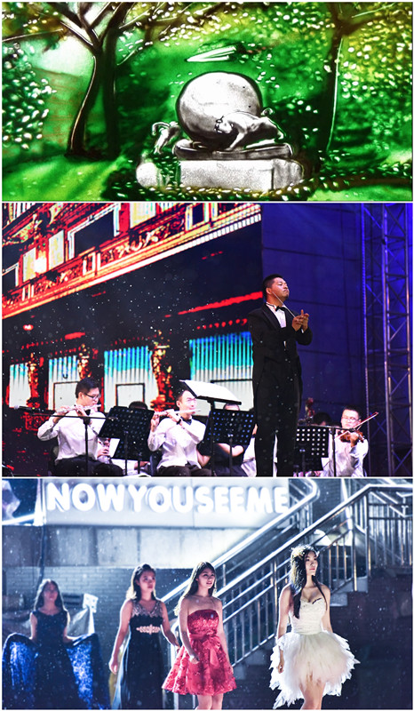 随着交响乐团《康康舞曲》乐音的渐弱,晚会倒计时正式开始。紧接着的灯光秀和激光舞,将所有观众的目光吸引到台前。而为晚会定制的开场沙画视频,从也西湖到科技之花、孺子牛、中国科大星、运动场,视频上报到的红裙女孩渲染出整场舞台的旋律。