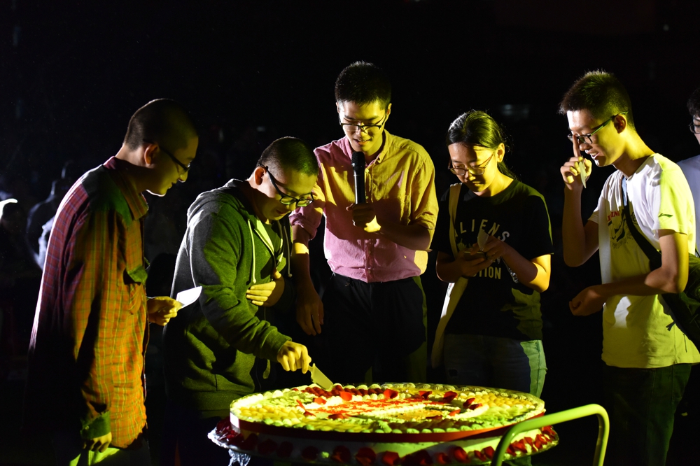除了精彩的文艺节目,晚会还有三个互动环节:鼓励新生上台勇敢喊出自己名字的《NOW YOU SEE ME》,集齐卡片兑换礼包的台下互动,以及最后的集体庆生。项目组为观众们送上了定制可乐、飞机模型、充电宝,还有直径一米的大蛋糕。