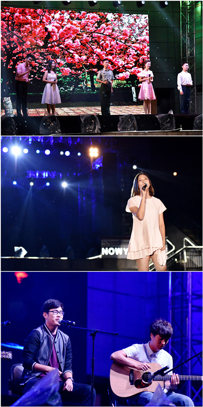帅气男神深情的演唱,一首粤语歌曲《我的快乐时代》让全场动容;翩翩衣袂,舞姿婀娜,红裙舞者用昳丽的身姿为我们讲述着心中的“大鱼海棠”;二胡弓起,笛声悠扬,玉手琵琶,民乐团带来的一曲《台湾追想曲》余音绕梁,扣人心弦;之后是美女歌手林可昕带来《不是因为寂寞才想你》,她还走下台来,与观众分享她的大学故事。