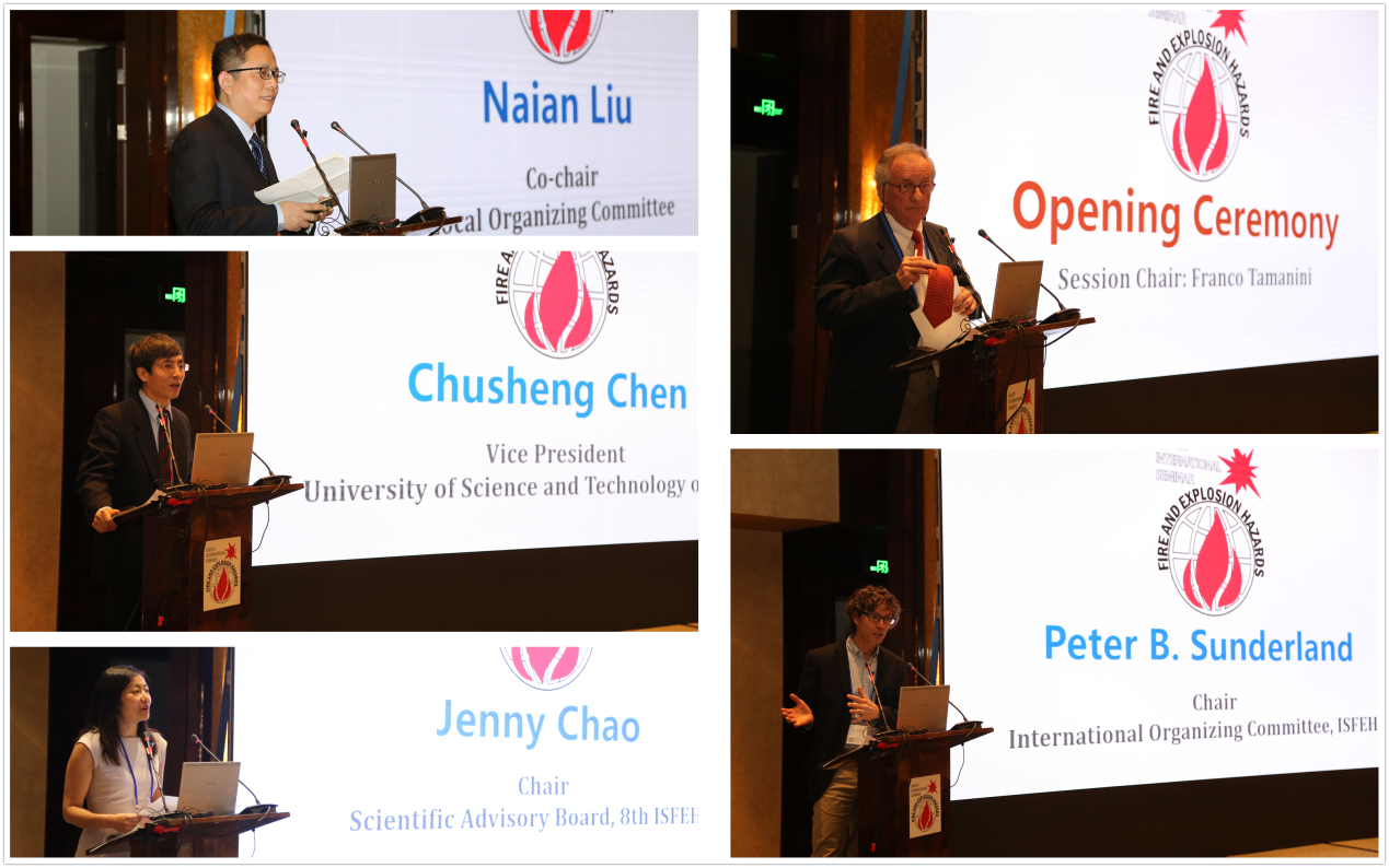 大会于4月25日上午隆重开幕,开幕式由美国FM Global研究中心高级研究员Franco Tamanini博士主持。中国科学院国际合作局董麒研究员和火灾科学国家重点实验室主任张和平研究员出席会议。中国科学技术大学副校长陈初升代表学校致欢迎辞,ISFEH国际组委会主席、美国马里兰大学Peter B. Sunderland博士和本次会议程序委员会主席、美国FM Global研究中心Jenny Chao博士分别致开幕词。火灾科学国家重点实验室副主任刘乃安研究员任大会主席。来自美国、英国、法国、德国、俄罗斯、中国、挪威、比利时、芬兰、瑞典、澳大利亚、日本、韩国、印度尼西亚和中国香港等15个国家和地区的120余位专家学者及来自火灾科学国家重点实验室的师生代表参加会议。