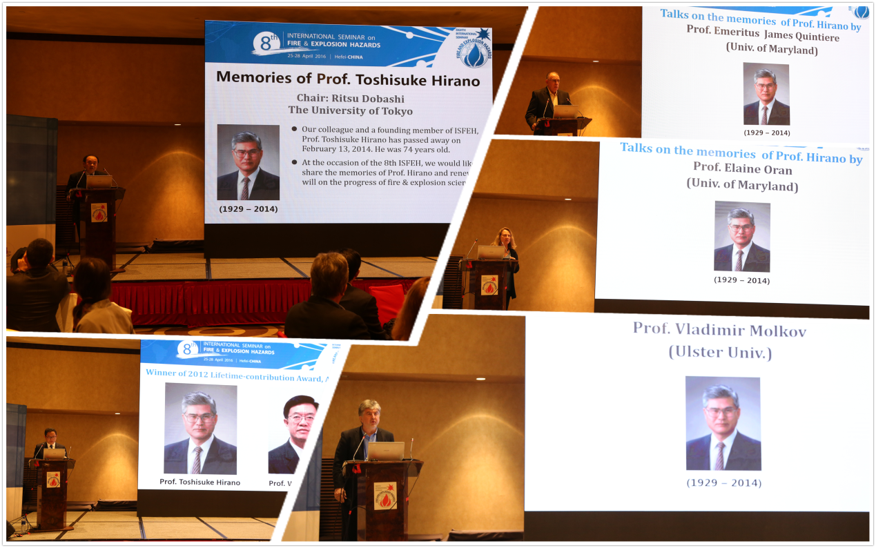 会议期间还举办了日本平野敏佑教授(Prof. Toshisuke Hirano, 1939-2014)纪念仪式。平野敏佑教授是日本东京大学前资深教授,曾任国际火灾安全科学学会(IAFSS)主席,亚澳火灾科学技术学会(AOAFST)主席,是ISFEH的创办人之一,曾于2004年获国际燃烧学会Bernard Lewis金奖,于2012年获亚澳火灾科学技术学会终身成就奖。他与中国科学技术大学火灾科学国家重点实验室有过多年合作,曾获得2002年度我国国家国际科技合作奖。