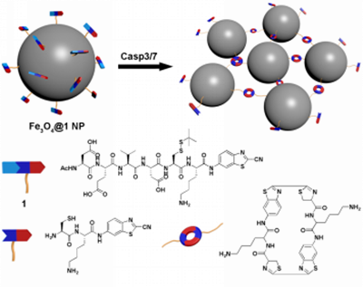 Caspase家族在介导细胞凋亡的过程中起着非常重要的作用,对Casp3/7的检测可以很好地监测肿瘤细胞的早期凋亡,从而评价肿瘤化疗的疗效,为后续肿瘤的治疗提供参考。核磁共振成像(MRI)是一种无放射、非侵入的影像学技术,且成像参数多、扫描速度快、组织分辨率高,是常见的影像检查方式。大的磁性纳米粒子或聚合物的磁共振性能比超小顺磁性氧化铁(USPIO)纳米粒子(NPs)在横向驰豫(T2)磁共振成像方面更具优越,但前者在血液中被很快清除,导致组织的T2信号降低。