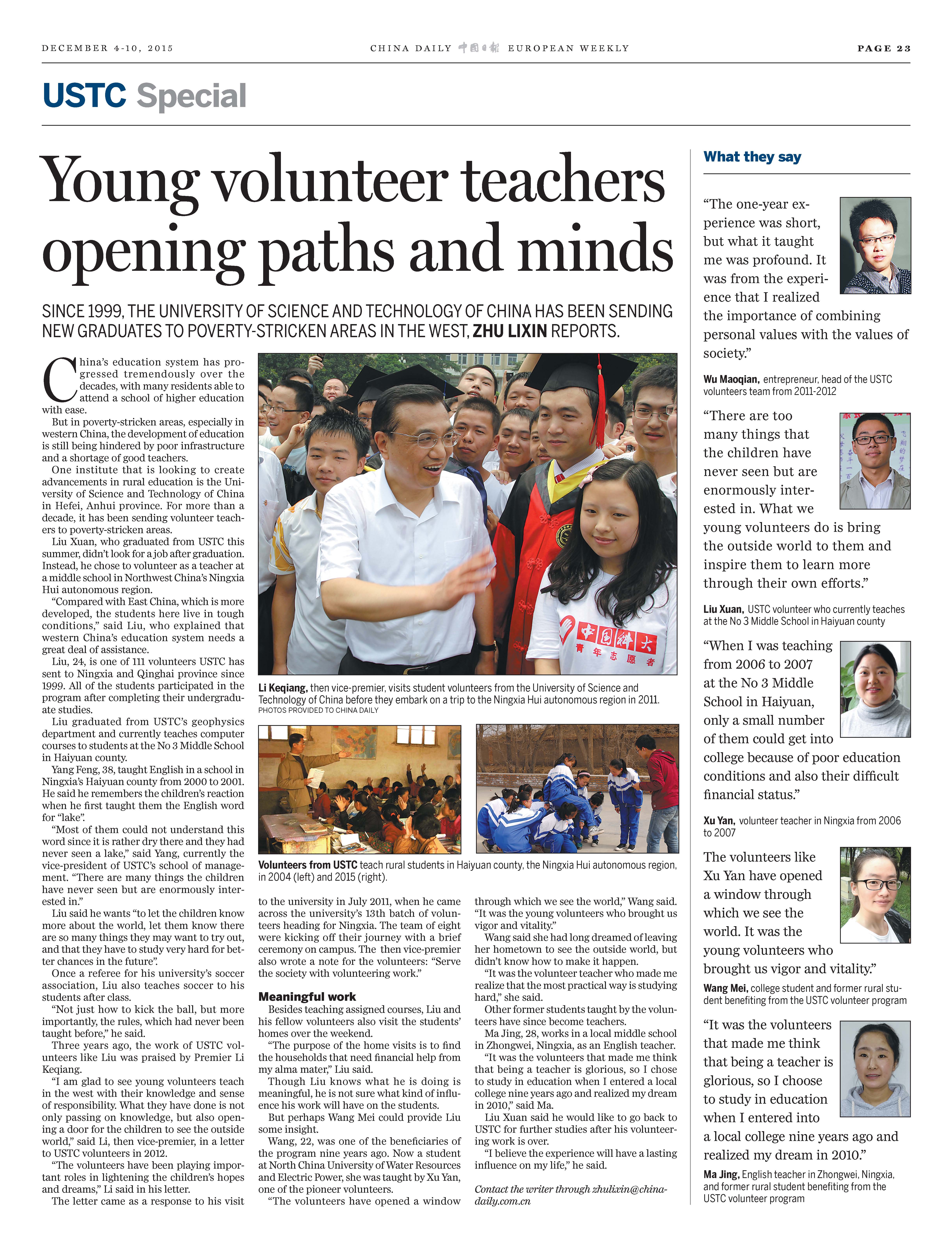 专版由两篇报道组成,分别是 ”Young volunteer teaches opening paths and minds” ( 《青年志愿者们开创了梦想之路》 ) 和 ”What they say” ( 《支教心路历程》)。前者首先介绍了中国边远贫困地区教育设施和老师的匮乏,而中国科大一直致力于为贫困地区孩子们教育创造条件,在过去十几年,向宁夏和青海输送了约111名青年志愿者。李克强总理2011年视察中国科大时,为即将出征的第13届中国科大支教队员们题词“志愿服务、报效社会”,这八个字正成为越来越多科大人的自觉行动。