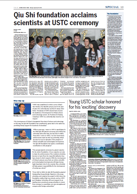9月28日,《China Daily》美国版整版推出“2015年求是奖颁奖典礼”以及“求是杰出青年学者奖”中国科大获奖人马明明的专题报道。本次颁奖典礼在中国科大先进技术研究院报告厅举行,由香港求是基金会主办、中国科大承办。