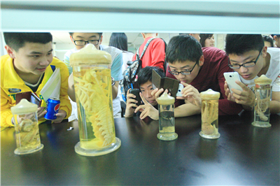生命科学学院科普点今年开放了听觉研究实验室、视觉研究实验室、认知神经心理学实验室、植物分子学实验室、肝脏免疫学实验室、神经发育与损伤修复实验室、分子遗传学实验室、细胞动力学实验室等9个实验室,学院一楼大厅还展示了2012年至2014年部分显微摄影作品。在植物分子学实验室里,不仅有水稻、烟草、拟南芥等植物不同生长周期的实物展示,参观者们还可以在志愿者的指导下通过显微镜观察植物细胞。在一楼大厅的留言板上,“我非常高兴来到科大”、“我真喜欢这所学校”、“我想当上中国科学技术大学的学生”、“世界没有不可能、学无止境”、“这个学校的活动真好”,参观者们通过留言表达了对活动的喜爱和对科大的向往。