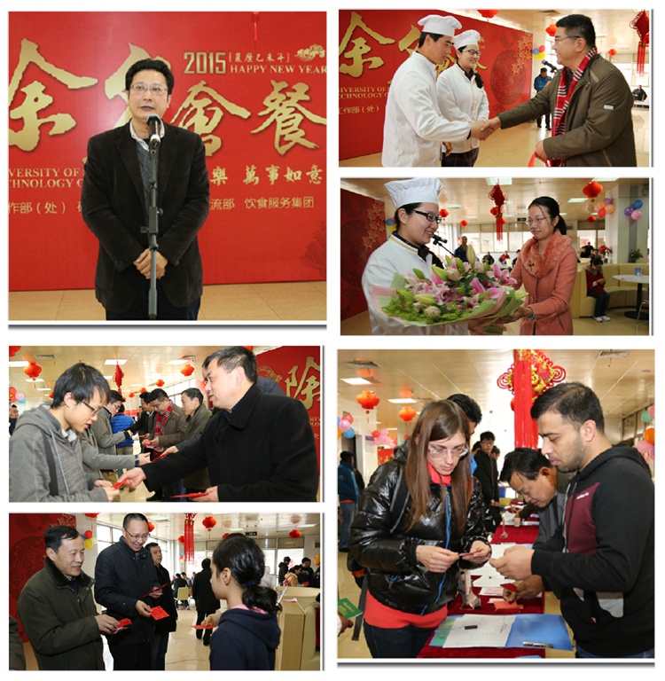 蒋一代表学校党政领导班子向参会师生表示慰问并致以新春祝福,向放弃与家人团聚和休息为举办餐会付出辛勤劳动的饮食服务集团职工、机关工作人员和院系老师表示崇高的敬意和衷心的感谢。他指出,为寒假不回家同学举办除夕餐会是我校的优良传统,也是我校关爱学子的具体举措,受到社会广泛关注和称赞。他希望大家在新的一年里共同努力,把学校建设得更加美好。
