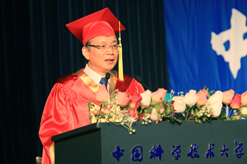 同学们,当你们带着专属于个人的毕业戒指离开母校,带着在科大收获的知识、友谊与爱情,踏上新的人生征途时,我也希望你们带着传承自科大的精神、文化和品格,与母校一同前行,共同追求属于中国科大人的光荣与梦想!相信许多年以后,同学们回首青春,将会想起难忘的科大岁月:自习室里的苦读、研讨课上的激辩、实验室里的探索、图书馆里的沉思,有迷茫中的彷徨、挫折后的失落,更有挑战后的无悔、成功后的喜悦……,你们在不断超越自我的过程中破茧成蝶,完成了人生中最重要的一次成长与蜕变。四年来,同学们不仅传承了科大严谨务实、勤奋治学的校风和学风,更展示了科大学子的蓬勃朝气与独特风采。你们在多姿多彩的社团活动中,培养兴趣爱好,结交志同道合的朋友;在各种场合的志愿者活动中,奉献爱心,服务社会;在Robocup、iGEM、挑战杯、辩论赛、龙舟赛等科技和文体竞赛中,奋勇拼搏,挥洒青春与激情;在海内外游学和交流活动中,取长补短,开阔视野。经过四年的学习和锻炼,同学们以优异的成绩和良好的素养,赢得了社会各界的广泛认可。在这里,作为校长和老师,我要对2010级点一个“赞”!同时,我也代表全校师生员工向大家表示最热烈的祝贺和最衷心的祝福!