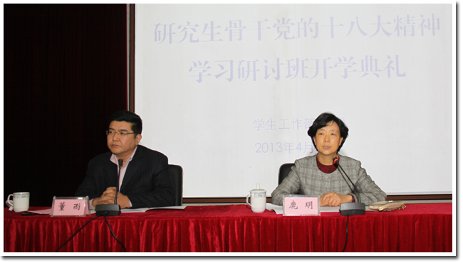 鹿明指出,党的十八大胜利召开为国家和民族的未来发展指明了方向,作为研究生骨干要深刻领会党的十八大的精神实质,珍惜研讨班提供的学习机会,认真学习有关材料,开拓视野,进一步提高思想政治素质,真正树立起为国家发展和社会服务的责任意识,真正成为国家和民族可以信赖的年青一代。她说,“立德树人”是高校办学的灵魂,也是学校人才培养的关键。研究生骨干要深刻理解“实干兴邦、空谈误国”的实践内涵,发挥先锋模范作用,真正做到“党员是永不换届的班委”,使党支部和班集体成为同学们共同学习、共同进步的精神家园。