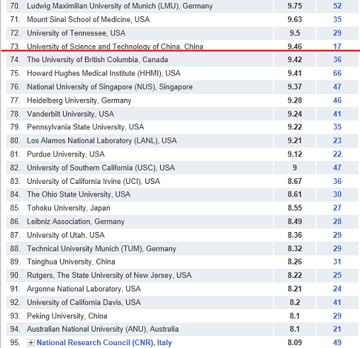 此外,自然出版指数还进行了2012 Global Top100科研机构排名,中国科大位居全球第73名,中国科学院(12名)、清华大学(89名)、北京大学(93名)也分别入选该榜单。