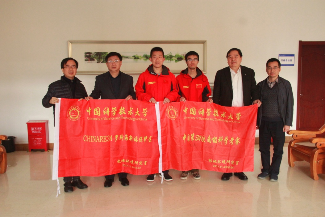许武书记勉励队员们说,我校的极地研究工作最早由孙立广老师开始,是科大的特色,希望年轻一代继续努力,不辜负大家的期望,取得更大的进步,并预祝考察圆满成功。包信和校长亲切地询问了考察工作计划、考察期间的食住安排,并叮嘱大家在恶劣的南极考察期间要注意安全,期待明年凯旋。潘建伟常务副校长表示他很了解极地研究室的工作,鼓励大家继续为极地事业作贡献。三位校领导欣然为科大南极考察红旗签名。