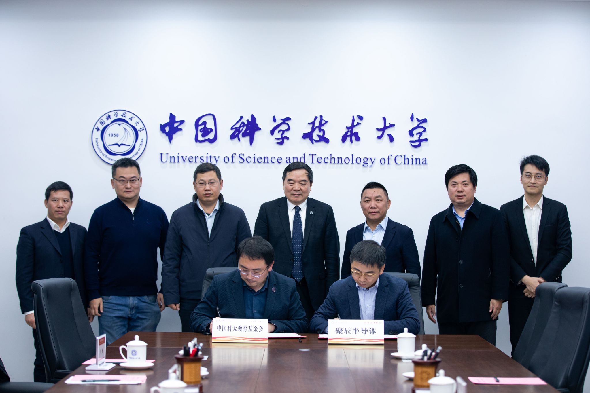 在与会嘉宾的见证下,聚辰半导体总裁张建臣与中国科大教育基金会秘书长周宇共同签署捐赠协议。