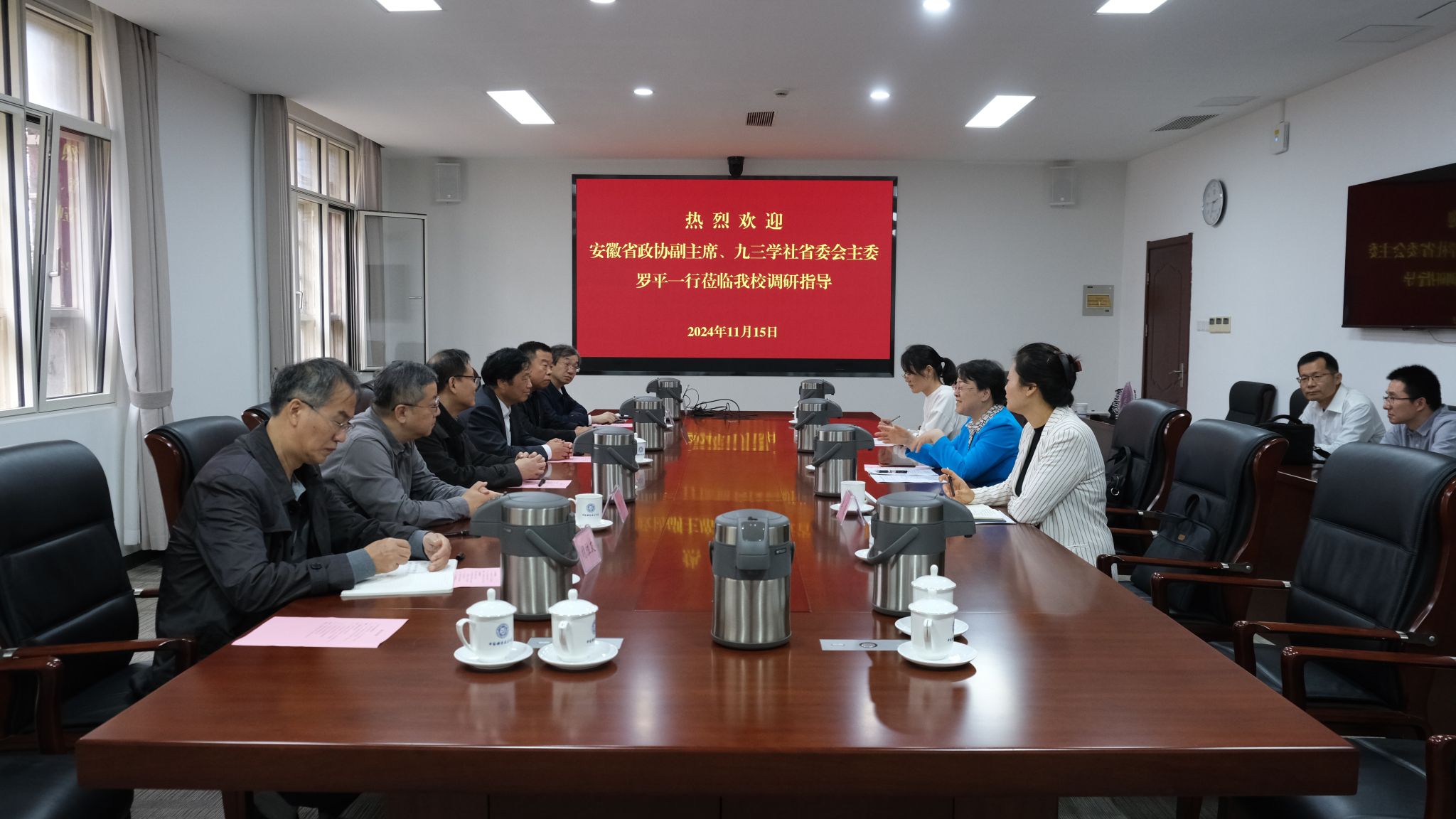 11月15日,安徽省政协副主席、九三学社安徽省委员会主委罗平一行就九三学社基层组织建设来我校走访调研,与党委统战部领导、九三学社社员代表座谈交流,听取意见建议。校党委书记舒歌群会见罗平一行,校党委常委、党委统战部部长李峰,党委组织部副部长、党委统战部副部长马壮参加座谈会。