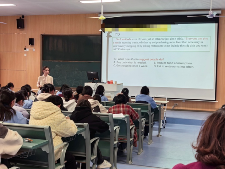 在展示课环节,安徽省十佳青年教师王瑜展示一节二轮复习课《阅读理解专项突破》,以2022年及2024年两年高考阅读理解真题为例,从命题人角度分析阅读理解考察的能力和设问的思路,带领学生实践整体阅读法,强调树立主旨意识、证据意识和抗干扰意识。