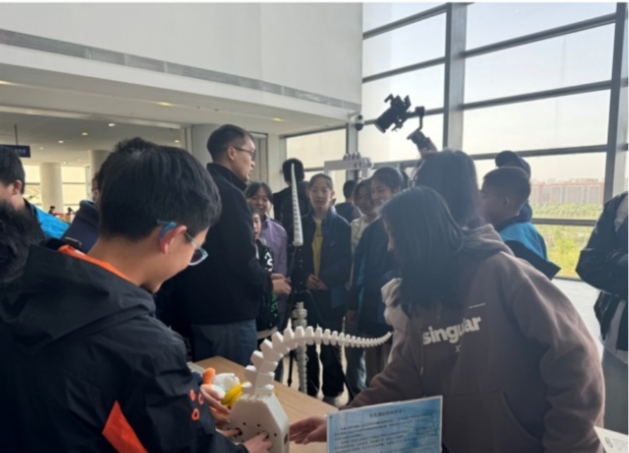 现场师生还共同参观了同步展出的机器人展区。参展的机器人有新型螺旋软体机器人、人形机器人、仿生灵巧手、历届Robogame比赛机器人等,团队负责人热情地向师生介绍、演示机器人的相关功能,吸引了众多师生咨询与讨论。
