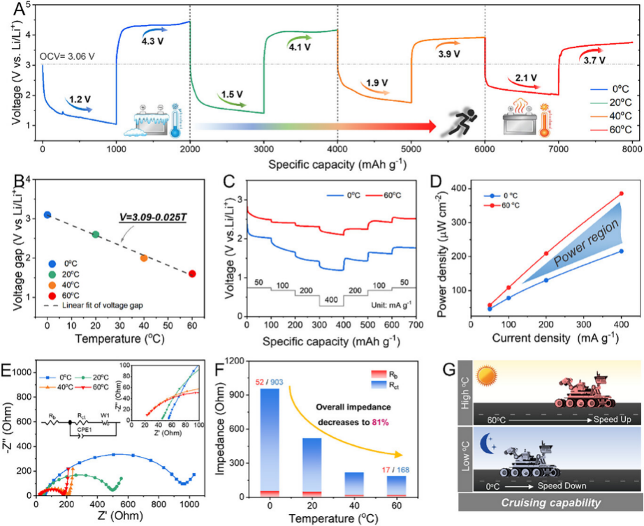 火星具有复杂的自然环境,包括含有多种气体的火星大气以及剧烈的温度波动。锂-火星气体电池因可直接利用火星大气释放电能,被视为未来火星基地的供能技术。然而,电池在宽温域下的反应路径复杂、界面易失效等问题制约其应用。本研究揭示了温度通过调控“两电子-四电子反应路径竞争”和“固态产物生长模式”主导电池性能,且低温下容量衰减的关键因素来源于过量无定形碳导致的界面钝化。