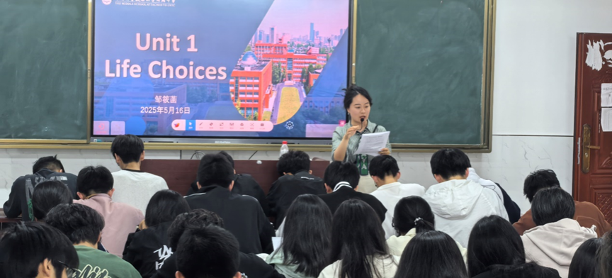 在教学展示环节,邹筱菡老师围绕“必修一Unit 1 Life Choices复习”主题,以“人生选择”这一话题为主线进行展示。通过精简的语篇片段和互动问答,将词汇复习与情感价值培养相结合,突出“用语言解决实际问题”的教学理念。
