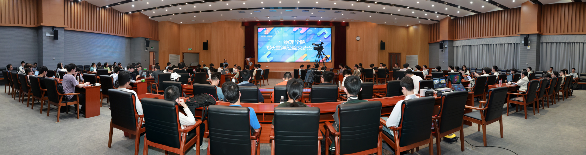 5月30日晚,物理学院在物质科研楼三楼报告厅举办飞跃重洋交流分享会。本次活动吸引了来自物理学院、少年班学院100余名同学踊跃参与,现场气氛热烈,座无虚席。