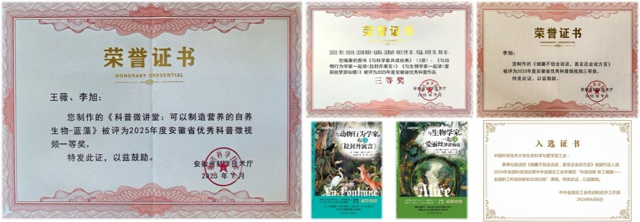 近日,我校生命科学与医学部党委委员、国家级生命科学实验教学示范中心副主任李旭副教授,在2025年安徽省优秀科普作品征集评选活动中收获多个奖项:与安徽省科技馆王薇老师合作的《科普微讲堂:可以制造营养的自养生物-蓝藻》荣获科普微视频一等奖;与中国科学技术大学出版社合作的《与科学家共读经典》系列科普图书(共两本)荣获科普作品三等奖;科普视频《细菌不但会说话,甚至还会说方言》荣获科普微视频三等奖,该视频已经被全国总工会收录,成为“全国职工科技创新知识培训班”课程内容。