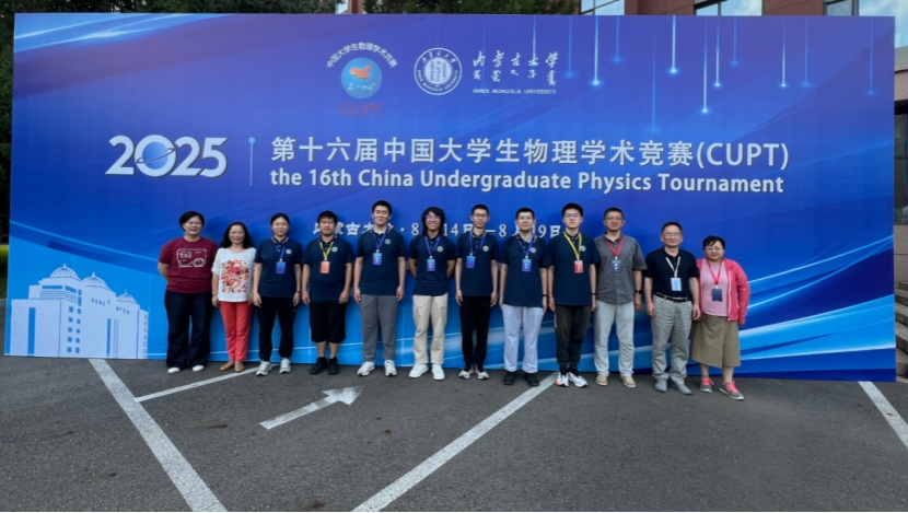 8月14日至18日,第十六届中国大学生物理学术竞赛(China Undergraduate Physics Tournament,简称CUPT)全国赛在内蒙古大学赛罕校区隆重举行。本次赛事由中国大学生物理学术竞赛组织委员会和教育部物理学育人模式改革虚拟教研室主办、内蒙古自治区物理学会与内蒙古大学联合承办,通过东北、华北、西北、华东、中南、西南六大区域赛晋级的66所高校共67支代表队参加了本次比赛,近700名师生齐聚一堂。由陈逸飞、黎奉熙、马圣訸、王子盈、薛飞扬、罗嘉宏和彭羿源组成的我校代表队凭借扎实的学术功底、卓越的团队协作和出色的临场表现,以五轮小组第一、总分第一的成绩晋级决赛,最终荣获全国亚军,充分展现了我校学生在物理学科领域的综合实践能力与团队风采。