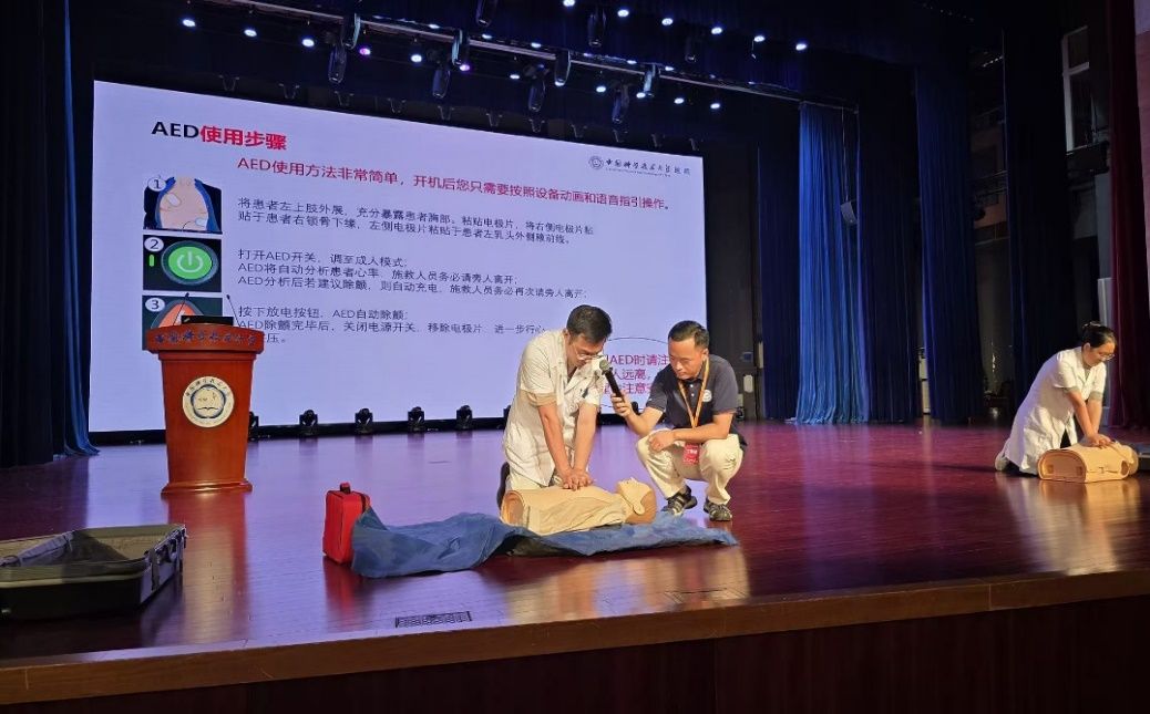 随后,校医院医务人员刘晨晖以理论结合实操的方式,重点讲解了心脏骤停“黄金四分钟”救援理念,并与同事安俊丽共同细致演示了心肺复苏(CPR)全流程,包括环境安全确认、患者评估、胸外按压、人工呼吸及AED使用等关键环节。