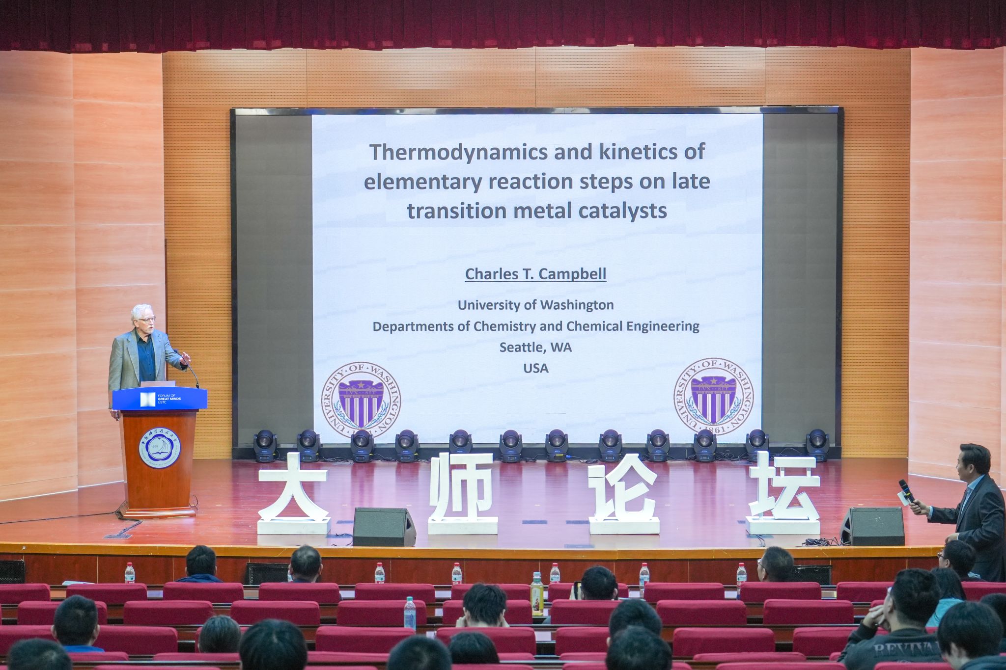 11月7日,国际著名物理化学家、华盛顿大学化学系讲席教授Charles T. Campbell应邀访问我校并做客“大师论坛”,在东区水上报告厅作题为“Thermodynamics and Kinetics of Elementary Reaction Steps and Catalytic Reactions on Late Transition Metal Catalysts(后过渡金属催化剂表面基元反应步骤与催化反应的热力学与动力学)”的精彩学术报告。国家同步辐射实验室朱俊发研究员主持报告会并致辞,国际合作与交流部副部长王晨向嘉宾颁发纪念证书。
