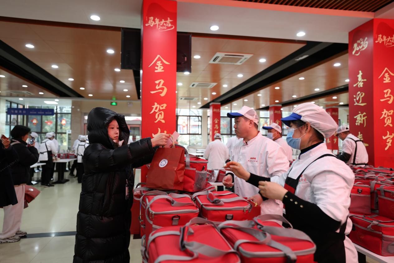 下午4时,东区学生食堂里暖意融融,工作人员将一份份精心准备的年夜饭大礼包送到现场学生手中。老师们与同学们亲切交谈,叮嘱同学们做好假期规划,合理安排学习和休息,学校也将全力保障留校学生的学习生活需求,努力营造喜庆温馨的新春氛围。