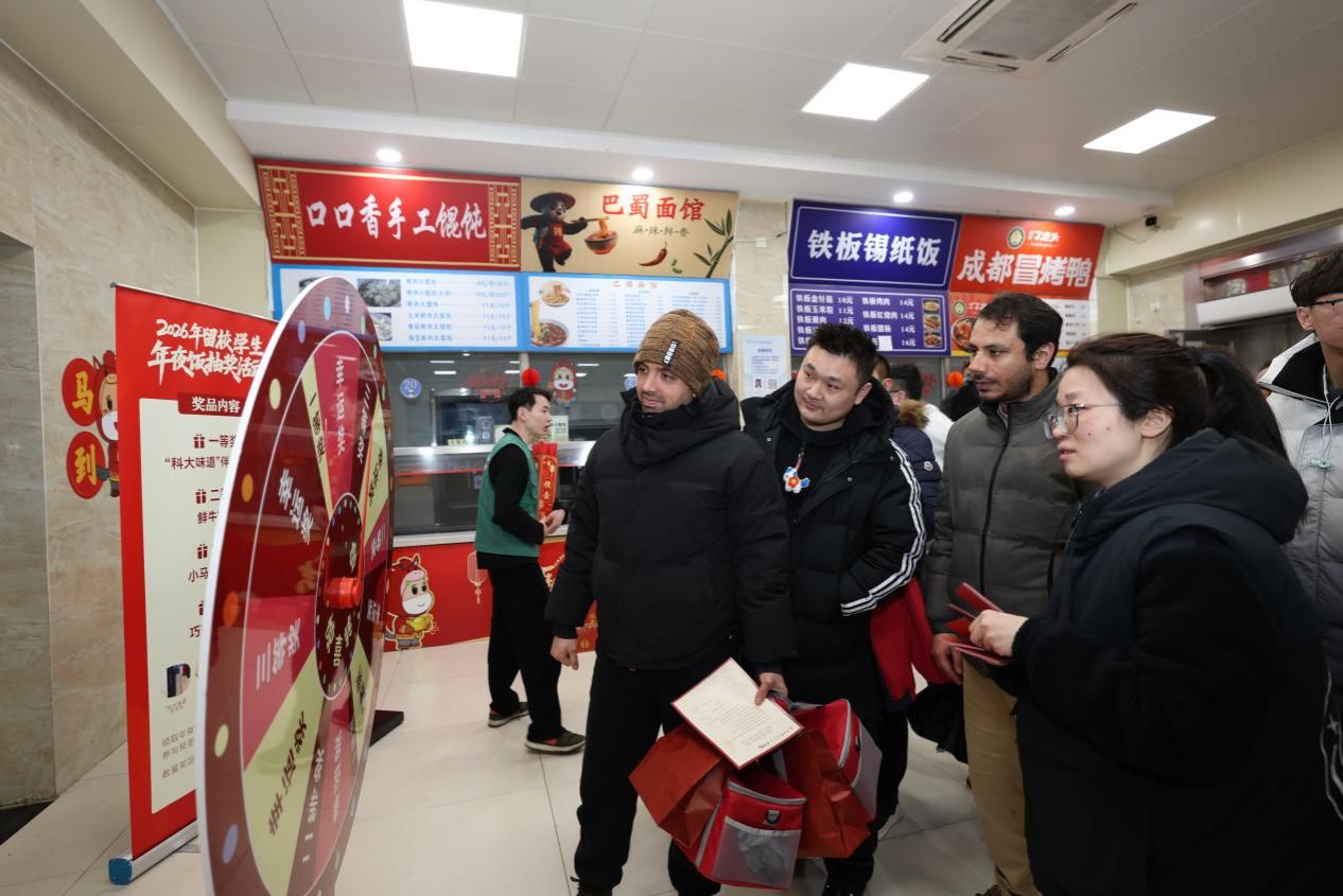 为了让留校学子吃上一顿暖心年夜饭,饮食服务集团提前多日筹备,在东区学生食堂和高新校区学生食堂同步推出限定版“科味团圆宴”大礼包。八菜一汤的丰盛套餐、现包现煮的手工水饺,搭配科大糕点伴手礼和年味十足的抽奖环节,让留校学生在烟火气中感受到浓浓年味与温情。