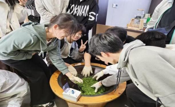 采摘归来,同学们参与手工炒茶实践。在工作人员的指导下,大家学习传统炒茶手法,亲手为茶叶塑形,于专注操作中沉淀心境。等待茶叶出炉的间隙,班主任与同学们围坐交流,氛围轻松融洽。
