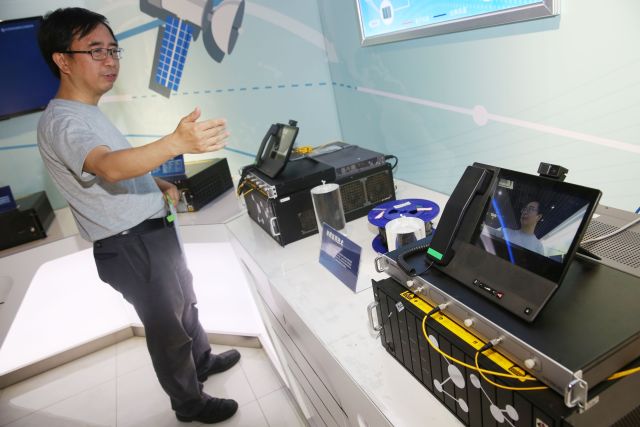 2016年5月28日,在量子保密通信上海总控中心内,量子科学实验卫星首席科学家潘建伟院士演示实用化量子通信产品进行远距离保密通话。