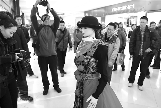 1月13日,机器人“可佳”在商场里引导顾客到指定商铺。 当日,由中国科学技术大学自主研制的“可佳”云交互机器人首次进入安徽合肥一家大型商场提供导购服务。新华社发