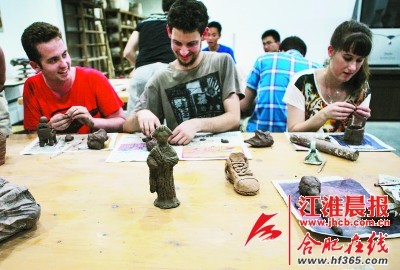 几名国外学生正在做泥塑 晨报记者 李福凯 摄