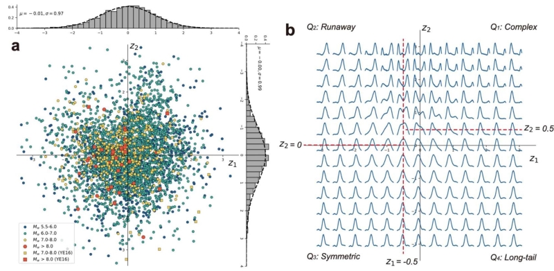 图1:全球地震震源时间函数在变分自编码器隐式空间的分布(a)和重构的全球地震破裂模式流形(manifold)(b)。