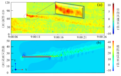 为进一步测试雷达观测性能和环境适应性,科研团队利用该雷达在高铁站实地测量了高速列车尾流中的风场结构。雷达在无人值守下连续稳定工作超过100小时,获得了3米和0.1秒高时空分辨率下的350km/h的高铁尾流连续观测。