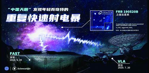 通过FAST平台,中科院国家天文台研究员李菂团队,首次获得原恒星核包层中具有高置信度的塞曼效应测量结果、首次提出了能够统一解释重复快速射电暴偏振频率演化的机制、发现了迄今为止唯一一例持续活跃的重复快速射电暴;FAST快速射电暴优先和重大项目科学研究团队,首次探测到距离快速射电暴中心仅1个天文单位的周边环境的磁场变化;中科院国家天文台研究员徐聪团队,发现了一个尺度大约为200万光年的巨大原子气体结构,比银河系大20倍,这是迄今为止在宇宙中探测到的最大的原子气体结构。上述5项重要成果均在《自然》《科学》上发表。