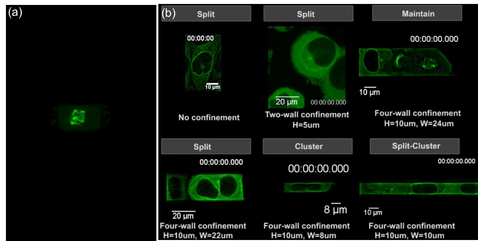 图2:(a)细胞五极纺锤体(四面受限)的三维重构图。(b)自由不受限、两面受限、四面受限内的细胞发生劈裂、维持、合并等行为。