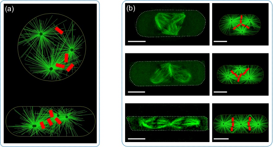 图3:四面受限的力学环境改变细胞形状,进而调控纺锤体的劈裂与合并行为。(a)计算模拟四面受限的力学环境调控纺锤体的劈裂与合并行为。(b)不同受限程度的三极纺锤体构型的实验结果(左)和计算模拟(右)对比。比例尺为10微米。